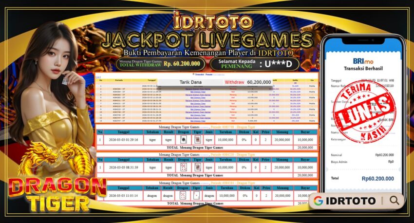 IDRTOTO JACKPOT PERMAINAN LIVE GAMES DRAGON TIGER Rp.60.200.000 – LUNAS