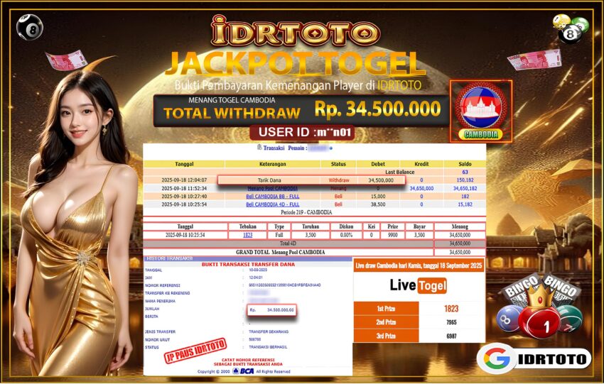 IDRTOTO BAYAR LUNAS JACKPOT PERMAINAN TOGEL CAMBODIA POOLS Rp.34.500.000 – LUNAS