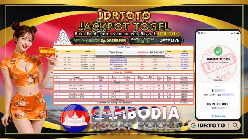 IDRTOTO JACKPOT PERMAINAN TOGEL CAMBODIA POOLS Rp.59.800.000 – LUNAS
