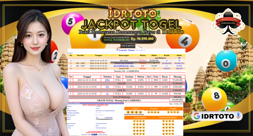 IDRTOTO BAYAR LUNAS JACKPOT PERMAINAN TOGEL CAMBODIA POOLS Rp.90.090.000 – LUNAS