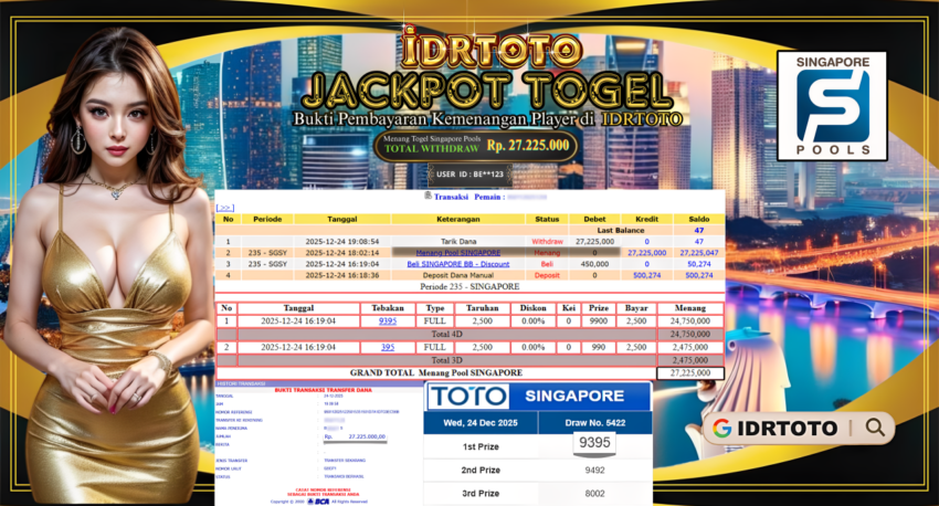 IDRTOTO JACKPOT PERMAINAN TOGEL SINGAPORE POOLS Rp.27.225.000 – LUNAS