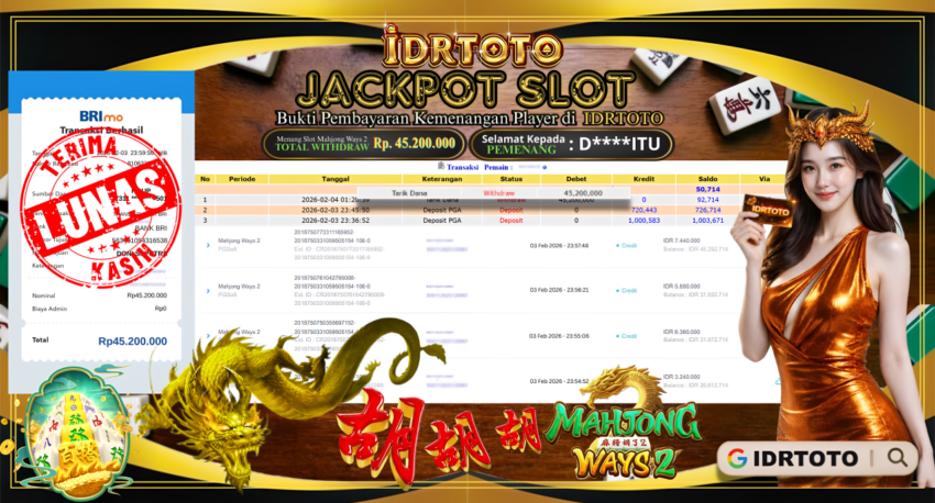 IDRTOTO BAYAR LUNAS JACKPOT PERMAINAN MENANG SLOT MAHJONG WAYS 2 Rp.45.200.000 – LUNAS