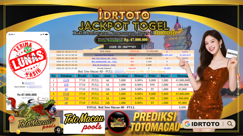IDRTOTO BAYAR LUNAS JACKPOT PERMAINAN TOGEL TOTO MACAU 4D Rp.47.000.000 – LUNAS