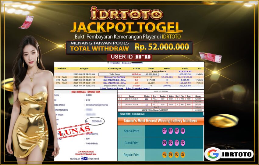 IDRTOTO BAYAR LUNAS TOGEL TAIWAN POOLS Rp.52.000.,000 – LUNAS